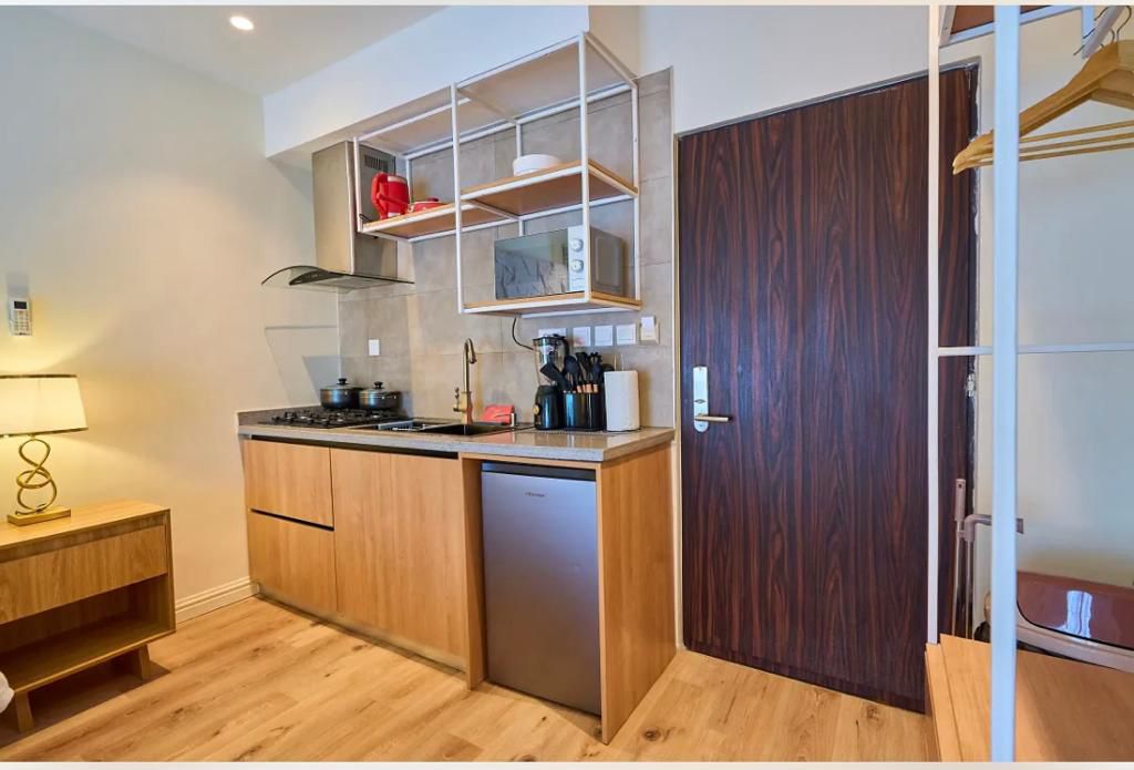 The open-style kitchen is fully equipped, featuring a refrigerator and microwave, allowing you to prepare your own meals at your convenience. You’ll also find a water heater for a warm and refreshing shower.